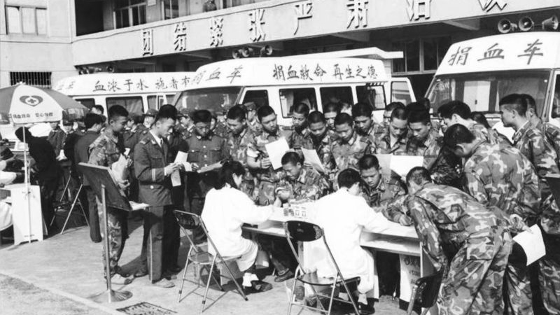 “深圳献血女状元”高敏在捐血现场协助医生工作