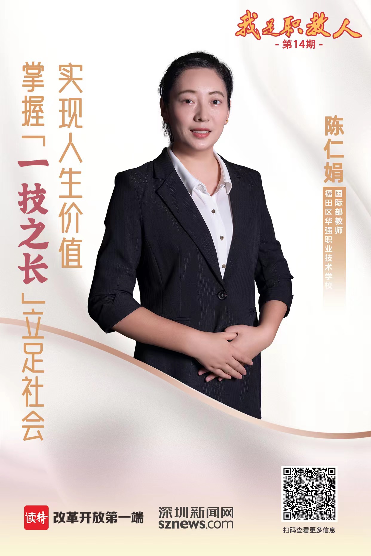 抱着对教师行业的热爱和教书育人的向往,深圳市福田区华强职业技术学校国际部教师陈仁娟,毕业后遵循从教初心,成为职教老师至今已有九年。