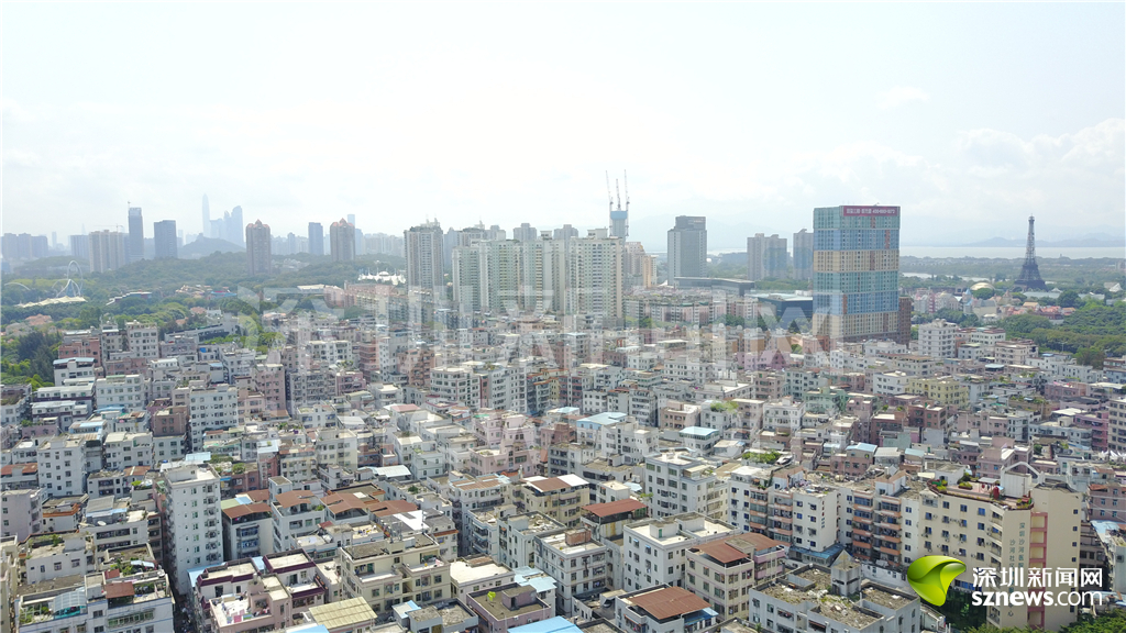 从白石洲低矮的“握手楼”上空看去,世界之窗标志性建筑“埃菲尔铁塔”依稀可见