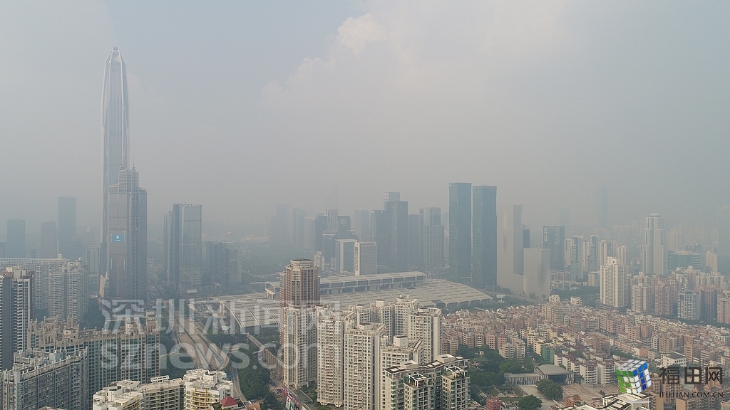 无人机在数百米高空俯瞰灰霾笼罩下的深圳中心区,大半个城区都看不清楚。