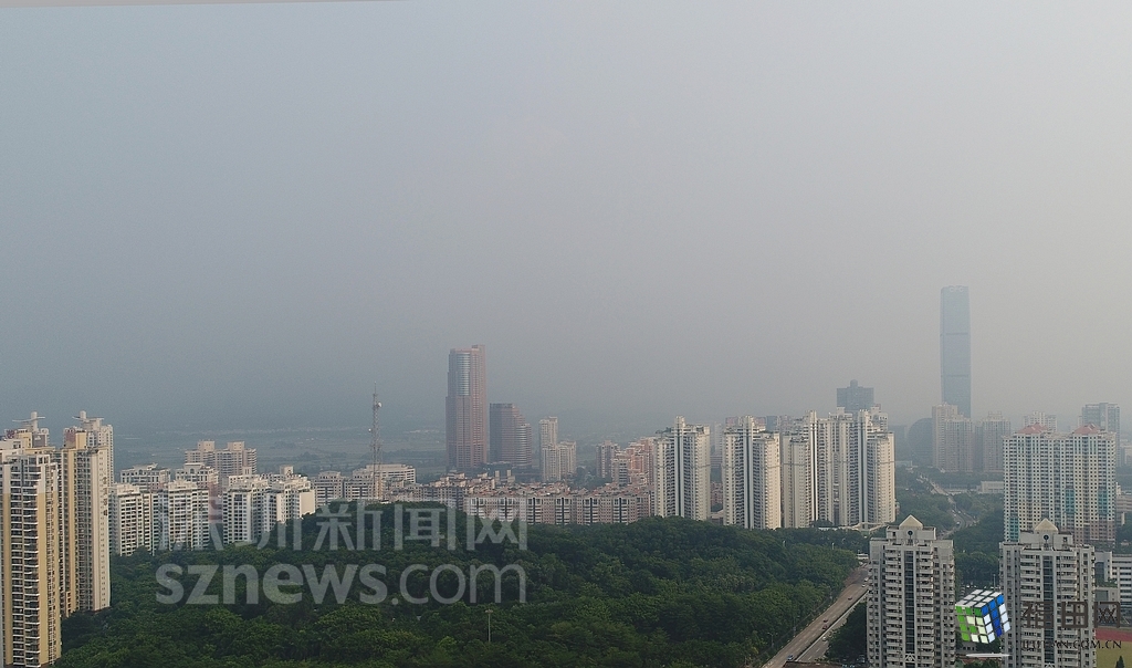 8月30日下午,记者通过无人机的视角看到,福田区许多地标性建筑物在灰霾的笼罩下显得“犹抱琵琶半遮面”,不能以“全面目”示人。记者从福田区委大楼极目远眺,目之所及处皆是白茫茫一片,深圳河对岸的香港米埔湿地玩起了“隐身术”,渐次消失在愈发浓厚的灰霾当中。而8公里之外平时清晰可见的京基一百大楼也“淹没”在一片灰霾之中,西北方向的梅林山和大脑壳山只剩下一片阴影的轮廓,其余低层的建筑更是“小隐隐于林”,肉眼无法看见。
