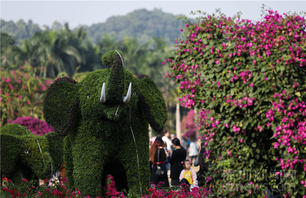 蝴蝶在簕杜鹃花上飞舞、逗留,孩子跟妈妈在簕杜鹃花坛旁玩耍,游客驻足于簕杜鹃花旁赏花拍照,构成了一幅莲花山公园的动人画卷。另外,风筝广场草坪上制作了高达6米, 占地300多平方米的大型立体花坛,以“复兴号”高铁、大雁塔、凯旋门等 “一带一路”元素,以艳丽的簕杜鹃做点缀,美丽的花海景观。