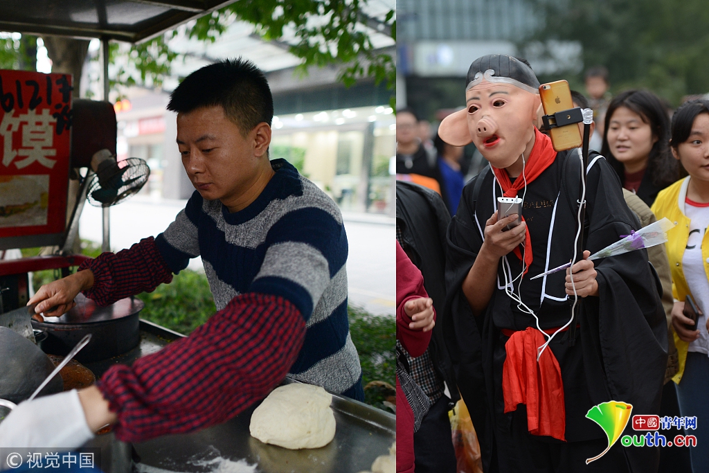 别看他只是个1991年出生的帅小伙,扮“猪八戒”做直播只是业余时的第二职业,而他真正的职业是肉夹馍老板,生意最好时月收入能达1万7千元以上。图片作者:邹乐