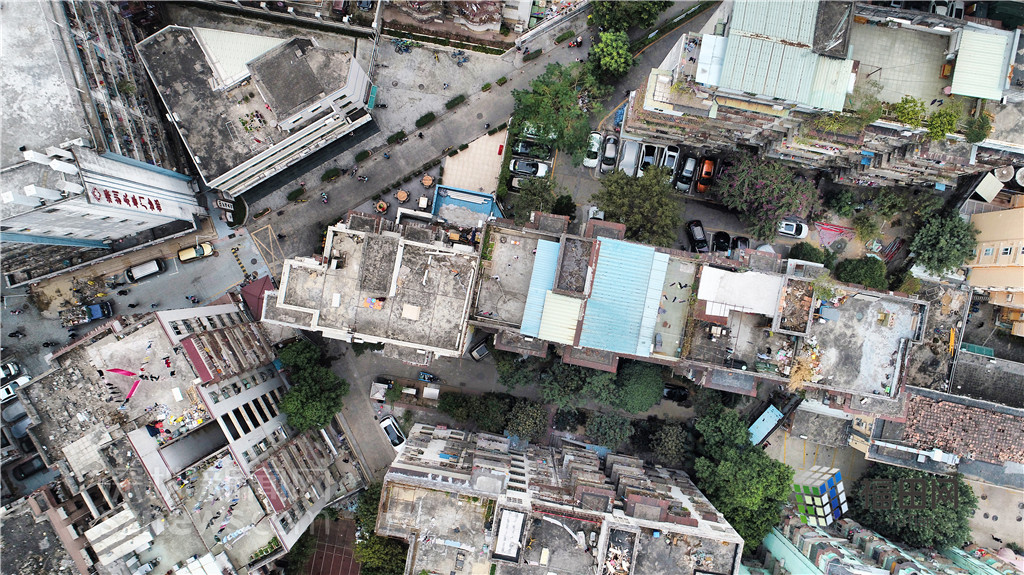 从无人机视野中,村内房屋虽然拥挤,但绿化很好。