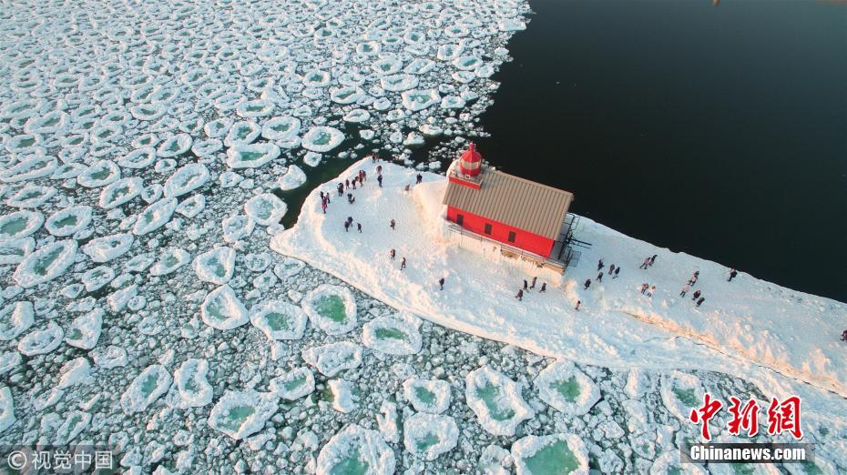 美国密歇根湖现冰雪奇观 满湖巨大圆冰似荷叶