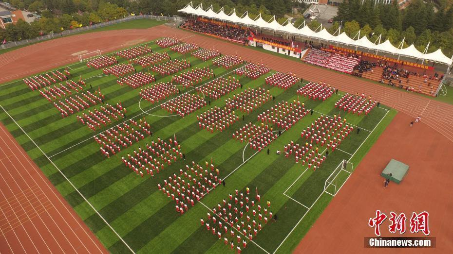 3月12日,航拍贵阳一中2018届高考誓师大会现场。当日,贵州省贵阳市第一中学举行2018届高考冲刺倒计时86天誓师大会,1700余名高三学子手举右手庄严宣誓,口号声响彻整个会场。中新社记者瞿宏伦 摄
