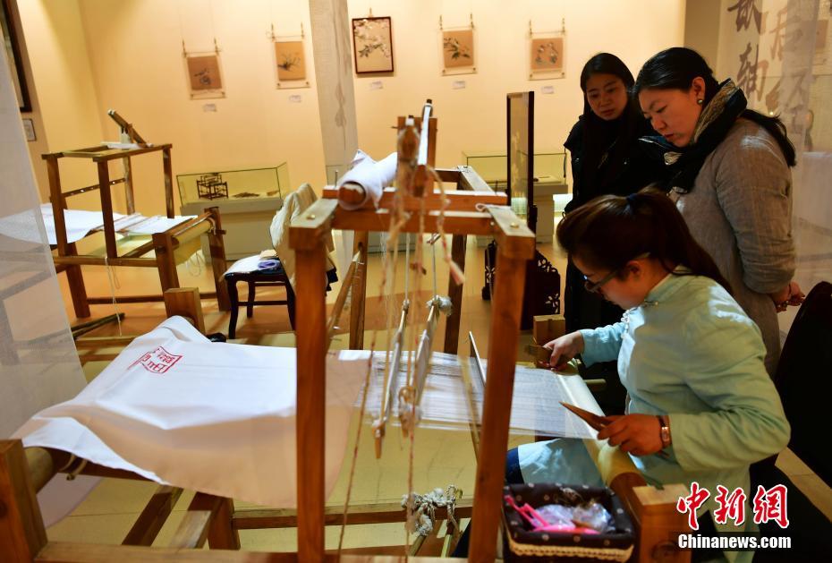 3月15日下午,河北石家庄市博物馆人来人往,正在此间展出的《“丝中之圣”缂丝艺术作品展》向民众“揭秘”了中国古代宫廷御用织物——缂丝。中国缂丝古有“织中之圣”和“一寸缂丝一寸金”的美誉,又被称为“千年不坏的艺术织品”。这种古老的工艺起源于河北定州,距今已有2500多年历史。由于工艺繁杂,一个熟练的工人一天只能织出几厘米缂丝,完成一件缂丝作品,短则需数月长则需数年。图为展出现场,学员展示缂丝技艺。中新社记者翟羽佳 摄