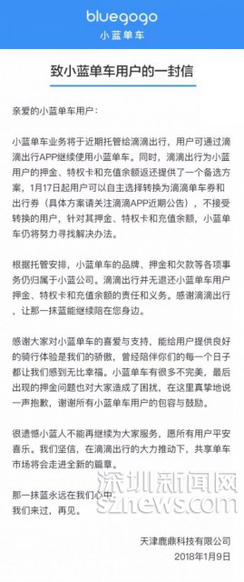 2018年1月,滴滴和小蓝联合发表声明,双方达成业务托管合作,滴滴用户可通过滴滴APP免押金骑小蓝单车,原小蓝单车用户的骑车券余额可转入滴滴使用,但小蓝的品牌、押金和欠款等仍归小蓝公司。