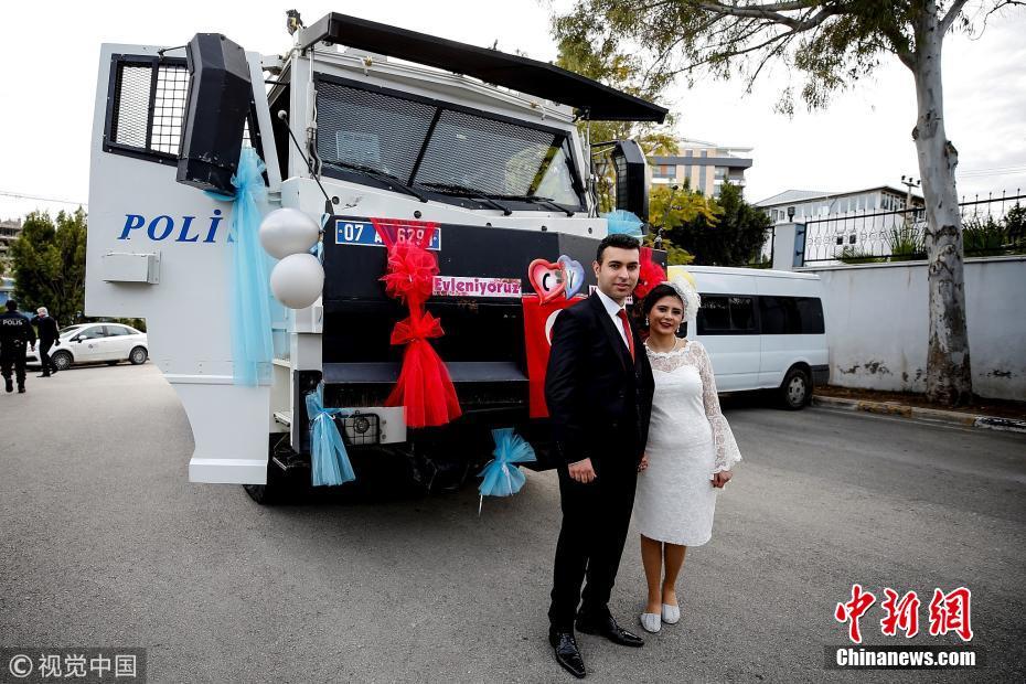 当地时间2018年3月21日,土耳其安塔利亚,警官Ceren Ekici和Taha YasinGul举行婚礼。在10个月前的一次行动中,Taha YasinGul不慎开枪击中Ceren Ekici的头部,所幸没有造成生命危险。他们的婚礼由警局同事操办,同事们举着防弹盾牌,护送这对新人走向礼台。图片来源:视觉中国