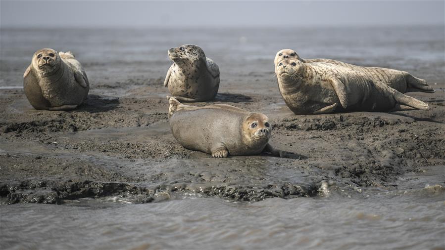 3月25日,几只斑海豹在辽宁盘锦双台河口三道沟海域的滩涂上休息。新华社记者潘昱龙摄