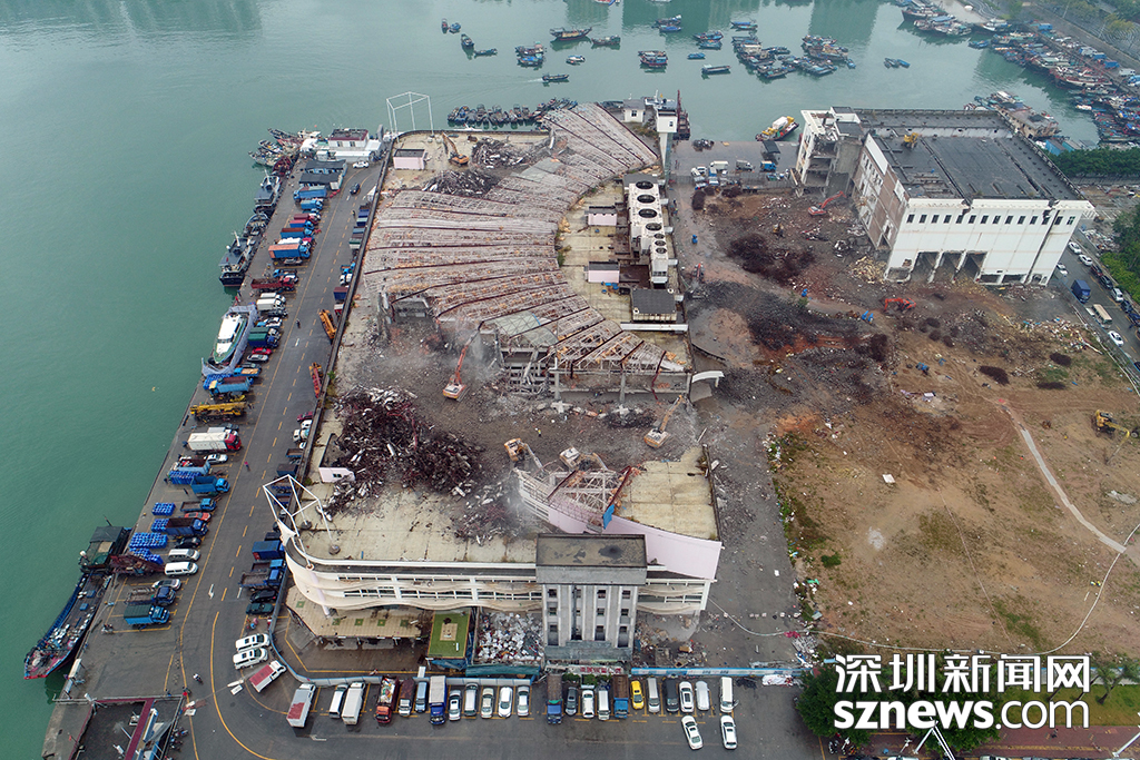 渔人码头拆除现场,原渔人码头水产交易市场的顶层已快拆除过半