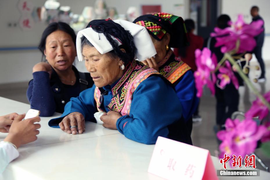 图为接受义诊后的病人领取药品。