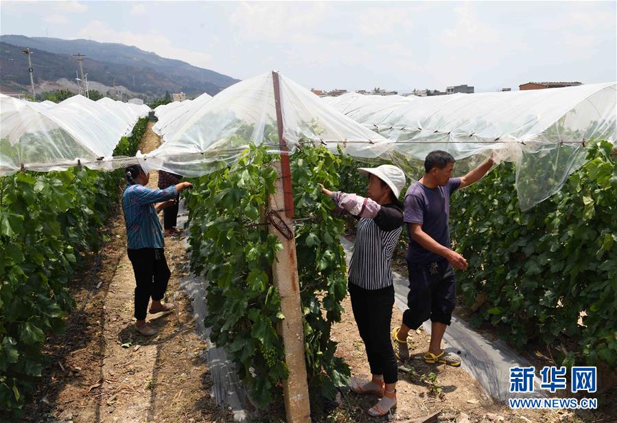 5月22日,曲靖市麒麟区珠街街道中所村村民在村合作社种植的葡萄园修剪枝叶。新华社记者杨宗友摄