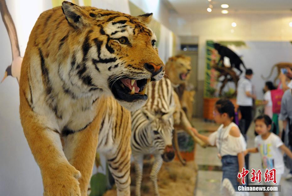 5月27日,各类飞禽走兽活灵活现地出现在民众的眼前。正在福建博物院展出的第四届中国动物标本大赛的257件惟妙惟肖的标本作品集中对外开放,让民众如进入“动物世界”。本次大赛汇集了全国标本制作企业、博物馆、大专院校、研究所等60多家单位参加,标本涵盖哺乳类、鸟类、爬行类、两栖类、鱼类等动物类群的皮张和骨骼标本。主办方希望通过标本大赛,向公众展现动物世界的美丽,宣传生物多样性和生态文明,借鉴吸收国际标本制作先进经验,提高中国野生动植物标本制作的整体水平。图为参赛的老虎标本。中新社记者 张斌 摄