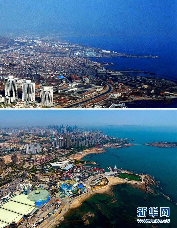 1996年起,青岛画报摄影师张岩乘坐直升机航拍青岛,开始记录这座美丽海滨城市的成长年轮。2018年,新华社记者用无人机航拍,对照老影像,记录新青岛。改革开放40年来,青岛作为我国首批沿海开放城市,已经成长为一座富有活力、时尚美丽、独具魅力的国际化城市,并成为新亚欧大陆桥经济走廊主要节点和海上合作战略支点的“双定位”城市。