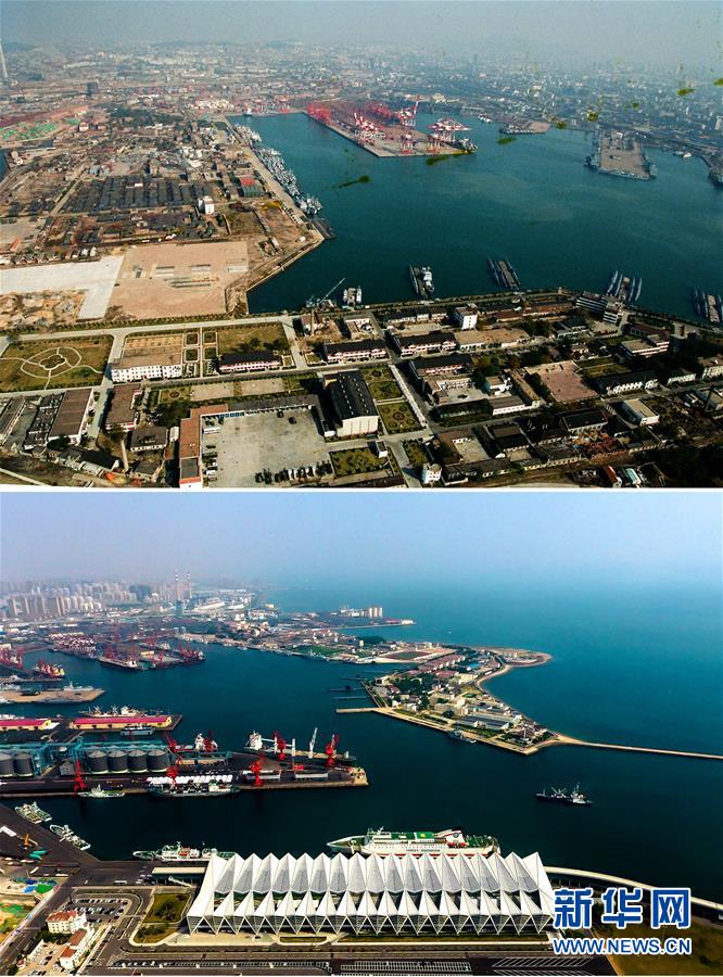上图:青岛画报摄影师张岩1996年拍摄的青岛港及周边。(张岩摄);下图:5月7日无人机航拍的青岛港及周边。新华社记者郭绪雷摄(拼版照片)