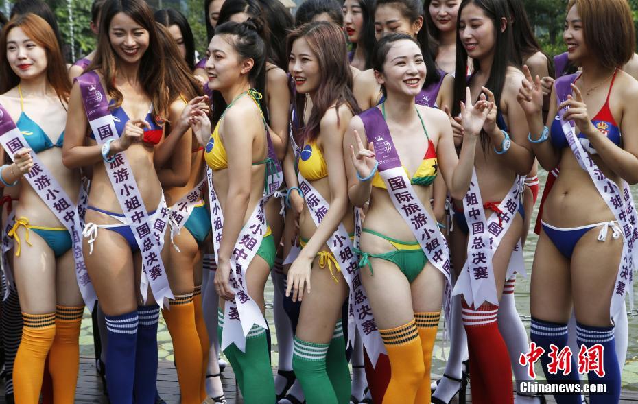 6月4日,正在浙江嘉兴参加2018国际旅游小姐大赛中国总决赛的佳丽来到云澜湾巡游。图为佳丽身穿比基尼上演一场“足球宝贝秀”。中新社记者钱兴强 摄