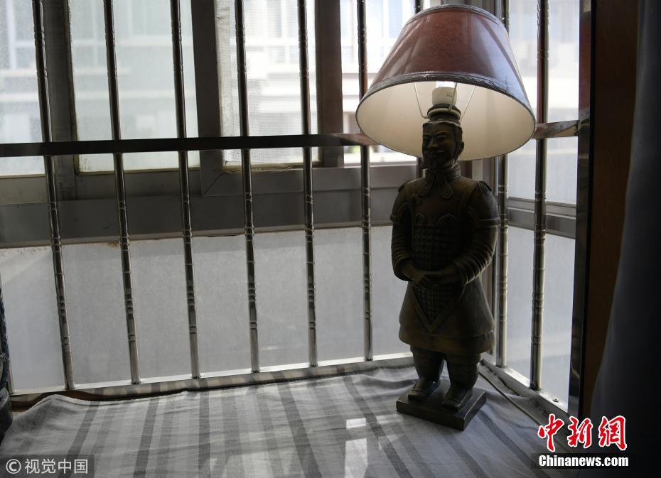 兵马俑元素在这家民宿里被运用在各种小细节里,图为兵马俑造型的台灯。图片来源:视觉中国