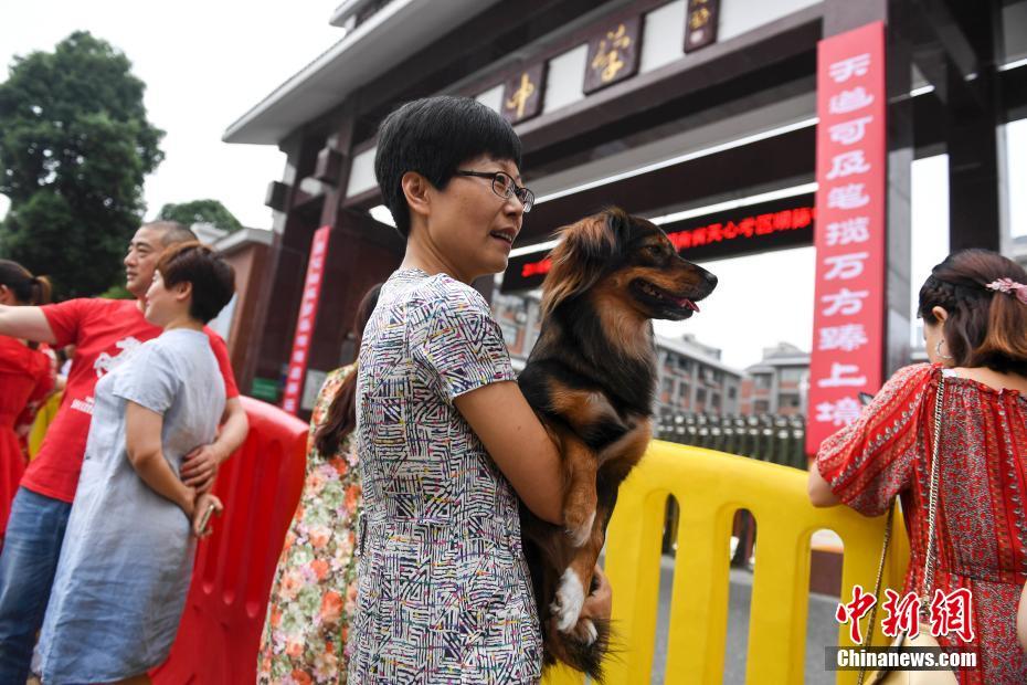 一位家长抱着小狗在长沙明德中学考点前陪考。 中新社记者 杨华峰摄