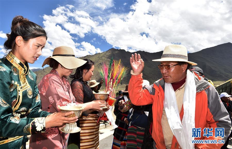 6月18日,嘎冲村群众(左)向来自远方的新邻居敬献青稞酒。 6月18日15时30分许,经过两天的驰骋,11辆大巴和31辆大货车缓缓驶入西藏拉萨市堆龙德庆区古荣乡嘎冲村,标志着西藏首个高海拔生态搬迁项目正式实施。这是一场跨越千余公里的远行。迁出地西藏那曲市尼玛县荣玛乡加玲加东村和藏曲村,分别距拉萨市1197公里、1247公里,平均海拔5000米以上。这两个行政村共有262户、1102人。据介绍,荣玛乡高寒缺氧,灾害频发,公共服务发展条件欠缺,不适宜人类生存,人均寿命远低于全区平均水平,且位于羌塘国家级自然保护区核心区内,属于国家禁止开发区。新华社记者觉果 摄
