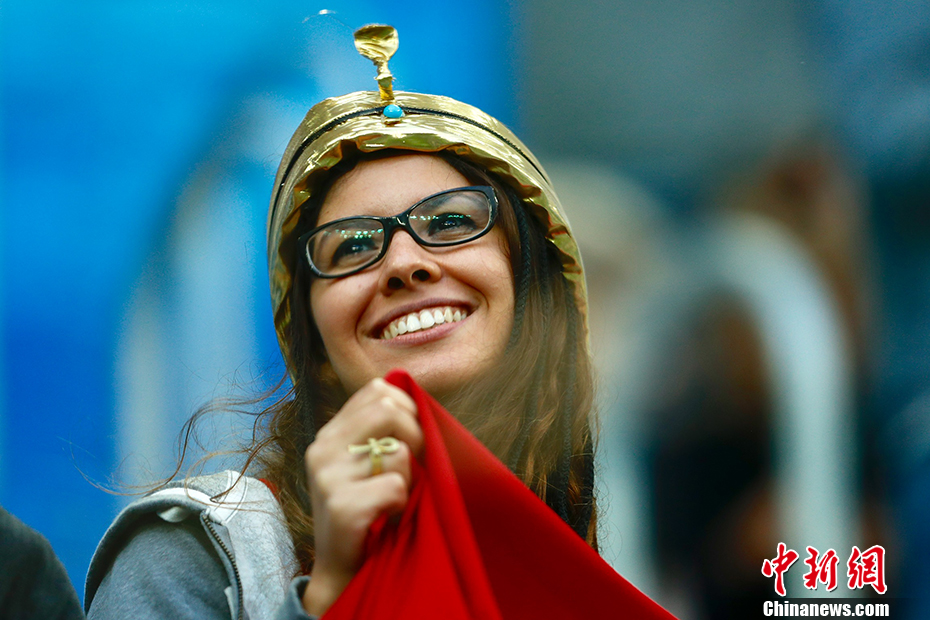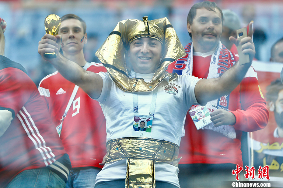 当地时间6月19日,2018俄罗斯世界杯小组赛A组俄罗斯对阵埃及的比赛将在圣彼得堡体育场举行。图为赛前看台上“法老”装扮的埃及球迷。中新社记者 富田 摄