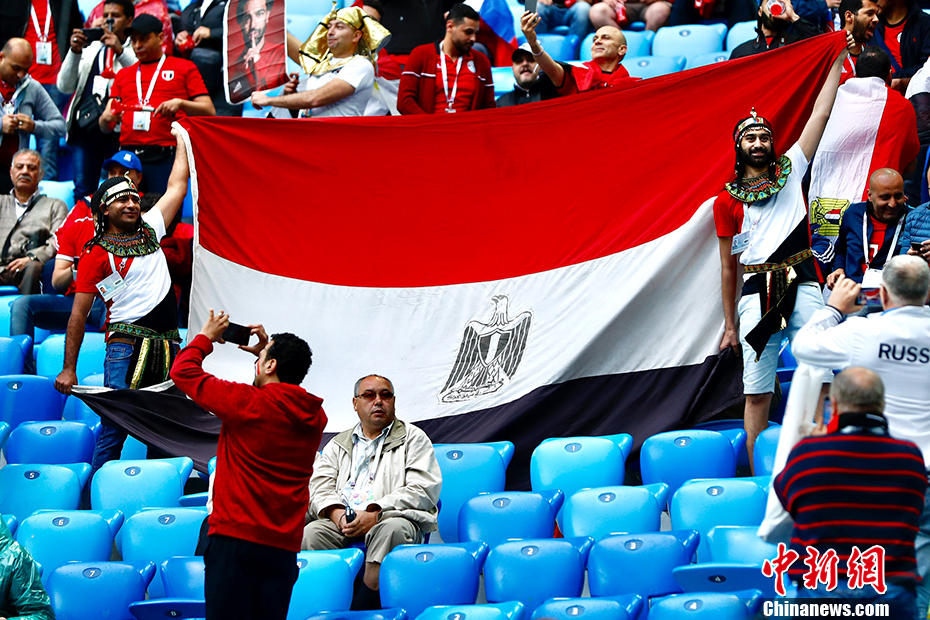 当地时间6月19日,2018俄罗斯世界杯小组赛A组俄罗斯对阵埃及的比赛将在圣彼得堡体育场举行。图为赛前看台上的埃及球迷。中新社记者 富田 摄