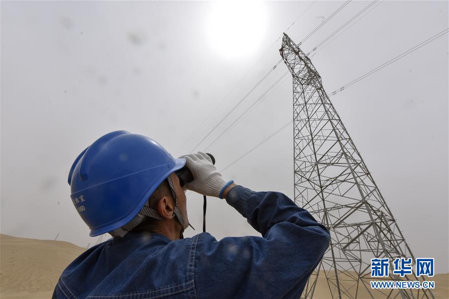 电力巡线工艾合买提·托合提在用望远镜查看电力线路(6月13日摄)。