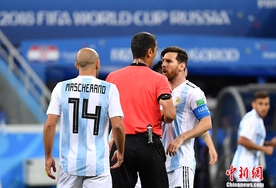 梅西与裁判交涉。 中新社记者 毛建军 摄