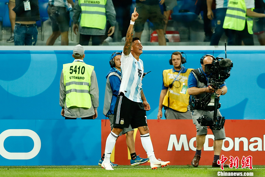 第86分钟,阿根廷队梅尔卡多传中,罗霍凌空推射打进死角。阿根廷再度超出比分,2-1。图为罗霍庆祝进球。 中新社记者 富田摄