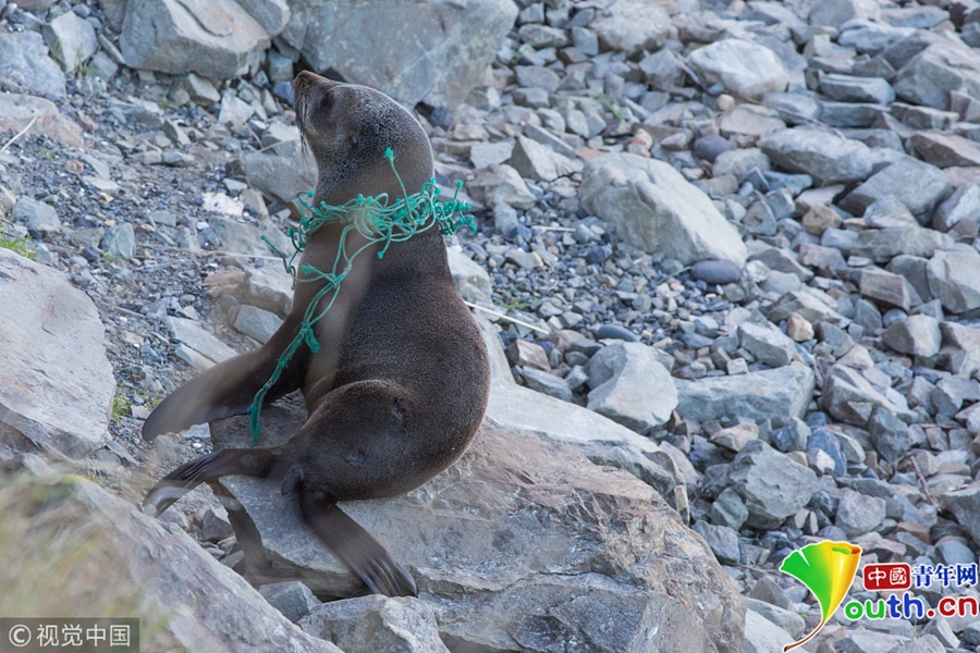 5月14日(具体拍摄时间不详),新西兰坎特伯雷凯库拉,一只落单的海豹被渔民的绳子套住脖子。据联合国统计,每年大概有64万吨渔网和钓鱼线被丢弃在海边。摄影师Geoffrey Reynaud拍下她悲伤地睁大眼睛似在求救。