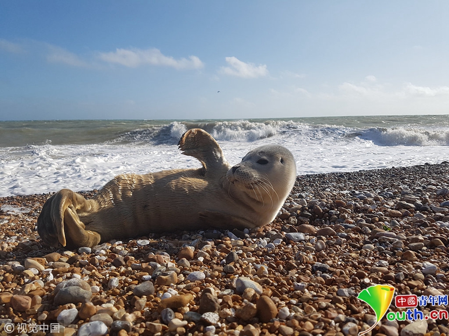 英国肯特郡邓杰内斯,46岁的达伦·伍德带着邻居家的孩子们钓鱼,这只可爱的海豹爬出海面跟他们“打招呼”。