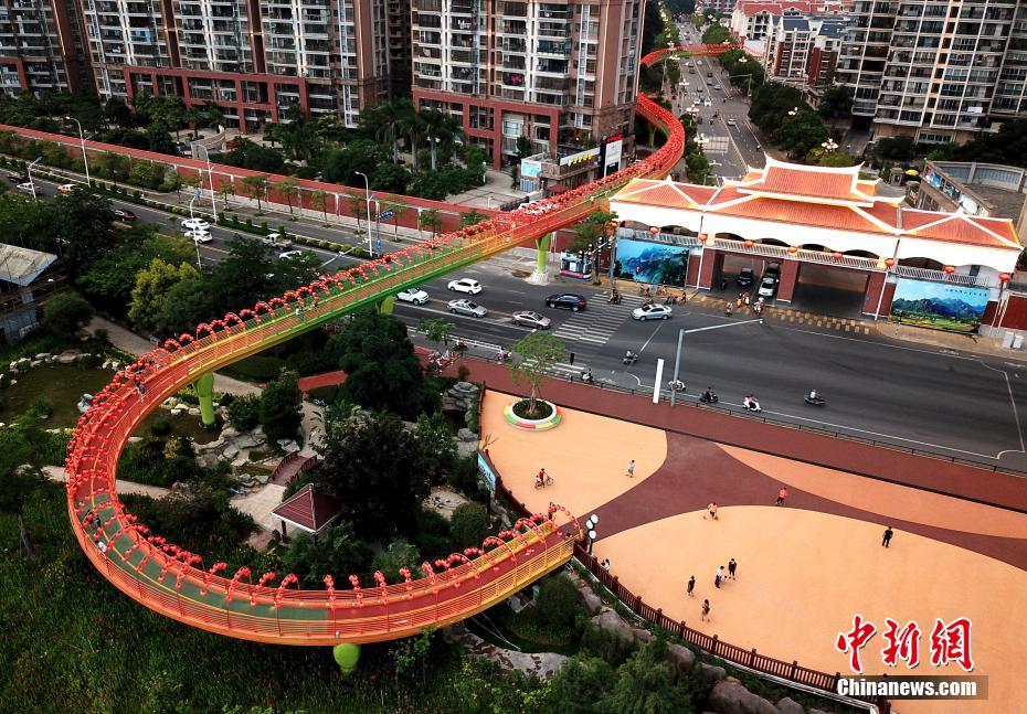 5月21日晚,空中鸟瞰福建省漳州市区里的“飘带”天桥。“飘带”天桥,全长约500米,宛如一条五彩缤纷的彩带悬在空中。天桥北接漳州古城,南连南山桥,将一江两岸、古城、古寺、古桥连为一体。中新社记者 王东明 摄
