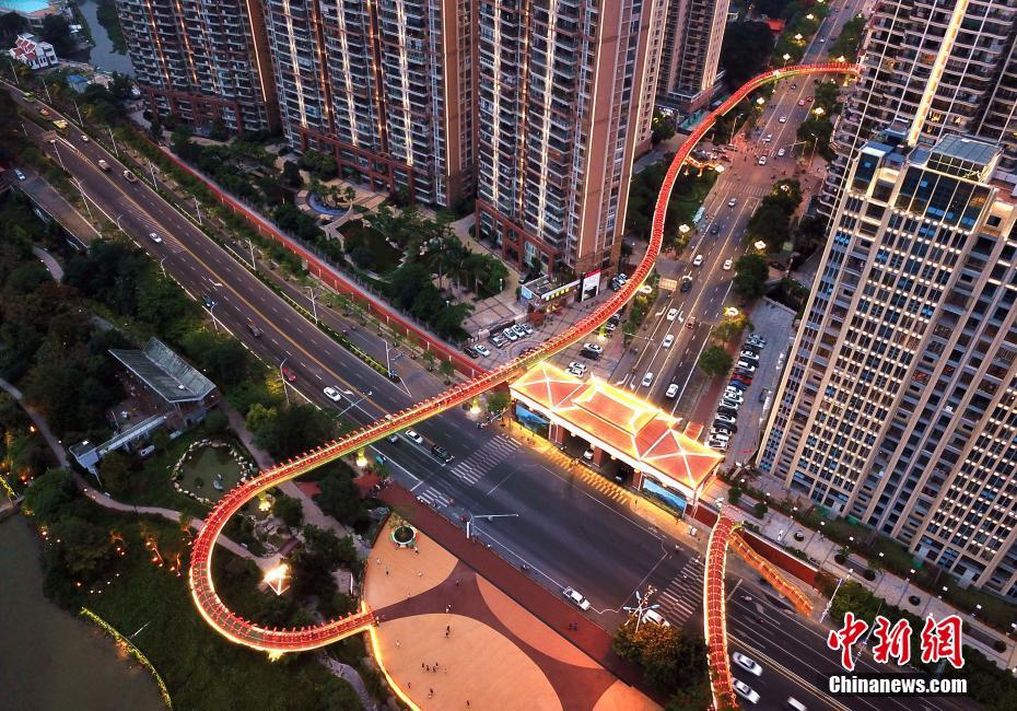 5月21日晚,空中鸟瞰福建省漳州市区里的“飘带”天桥。“飘带”天桥,全长约500米,宛如一条五彩缤纷的彩带悬在空中。天桥北接漳州古城,南连南山桥,将一江两岸、古城、古寺、古桥连为一体。中新社记者 王东明 摄