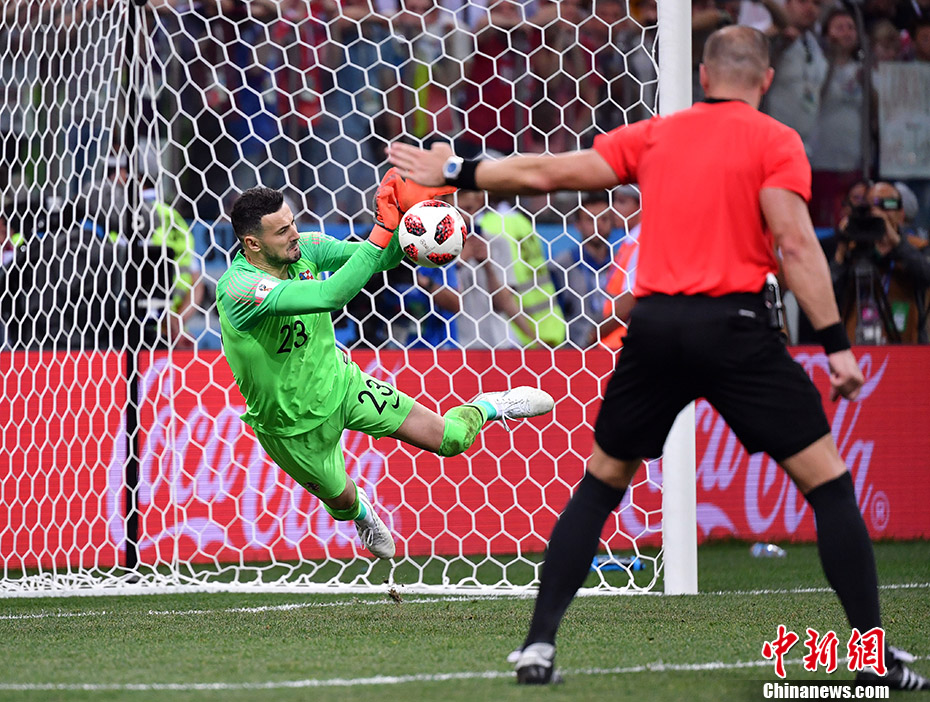 最终,在残酷的点球大战中,丹麦队埃里克森、舍内、约根森罚丢点球,克罗地亚点球大战3:2获胜,丹麦队遭到淘汰,“格子军团”克罗地亚成为第四支晋级8强的队伍。图为克罗地亚门将扑出点球。中新社记者 毛建军 摄