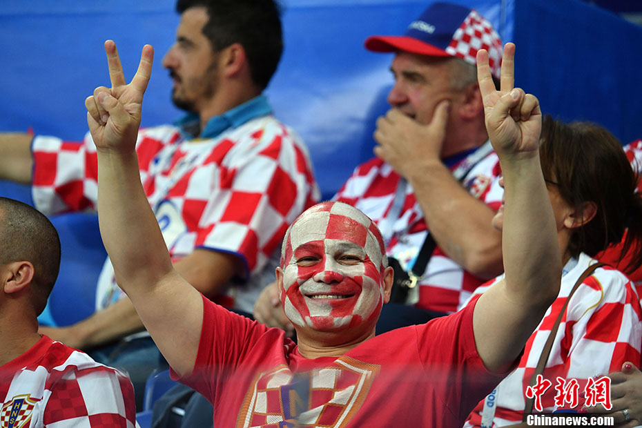 满脸“格子”的克罗地亚球迷。 中新社记者 毛建军 摄