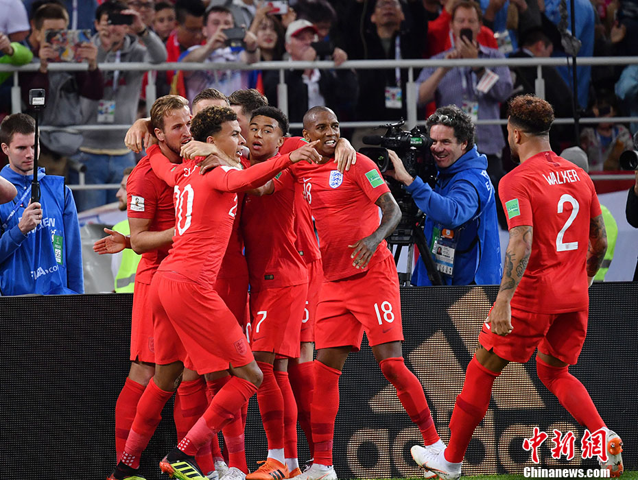 英格兰队庆祝进球。 中新社记者 毛建军 摄