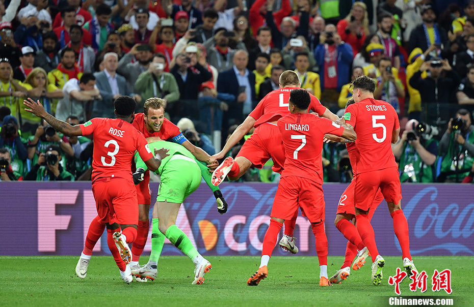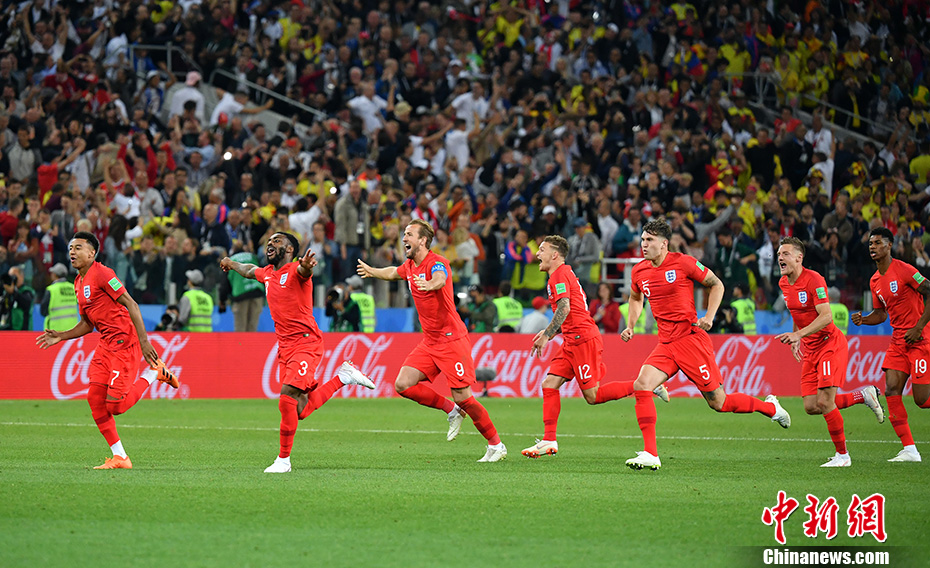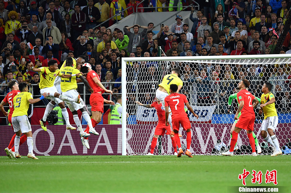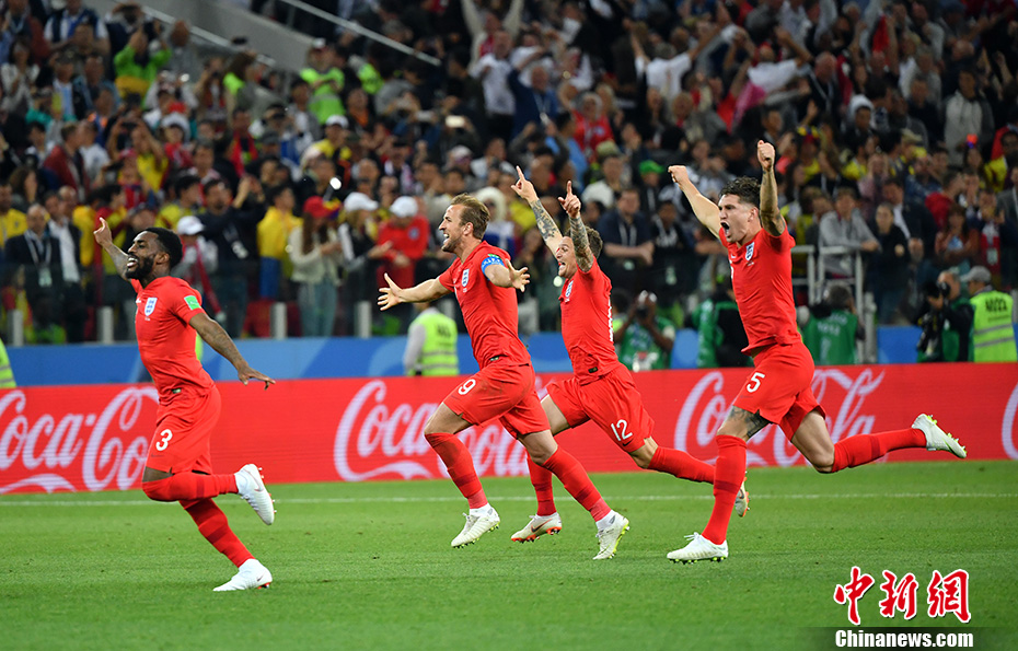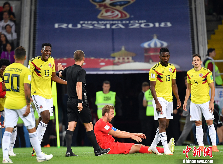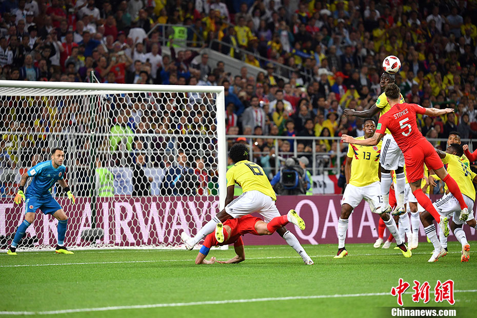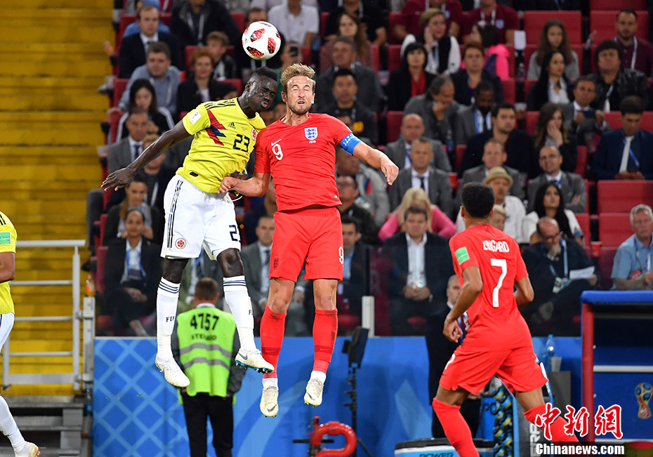 点球大战第一轮,法尔考和凯恩的点球分别命中;随后夸德拉多和拉什福德同样再次命中,前两轮双方打成2:2;第三轮穆里尔将球罚进,但是亨德森的射门却被哥伦比亚门将扑出;第四轮哥伦比亚队乌里贝的射门打在横梁上弹出,特里皮尔将球罚进,两队战成4:4;最后一轮巴卡的射门被门将扑出,英格兰队戴尔命中,最终英格兰点球大战4:3战胜对手,总比分5:4艰难晋级八强。中新社记者 毛建军 摄
