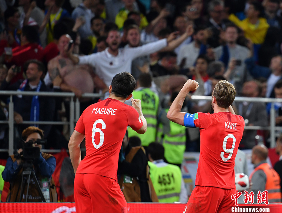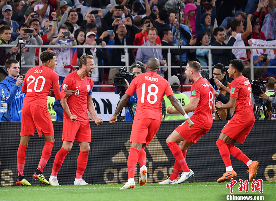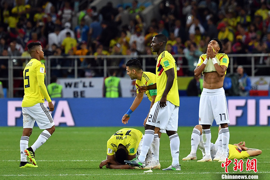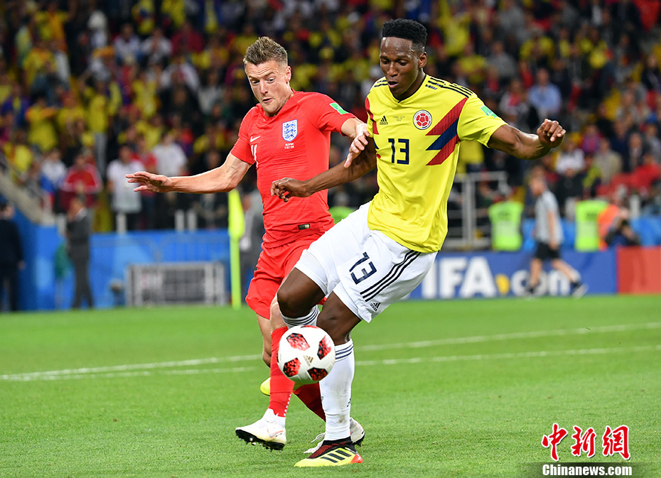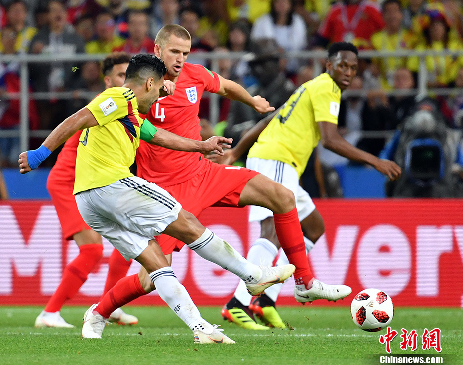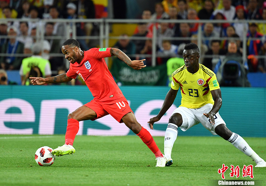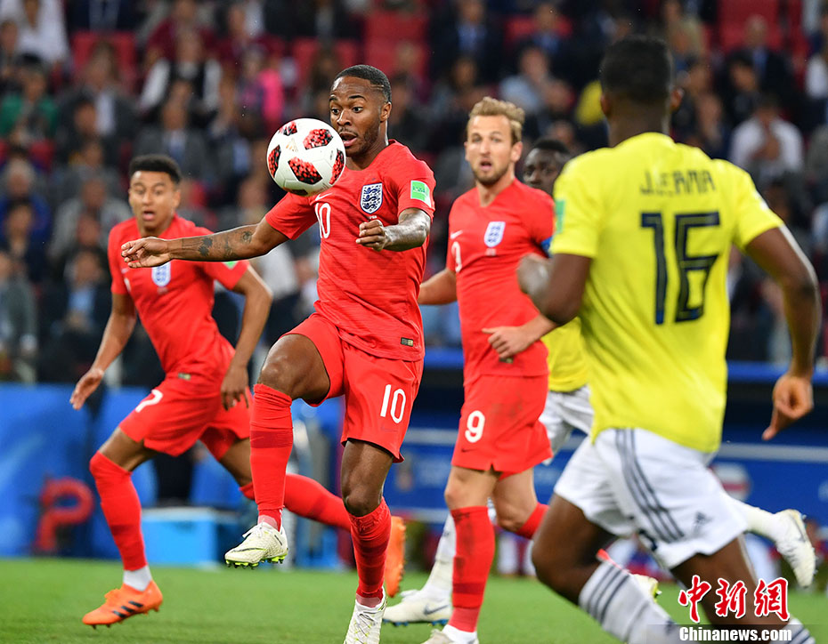 点球大战第一轮,法尔考和凯恩的点球分别命中;随后夸德拉多和拉什福德同样再次命中,前两轮双方打成2:2;第三轮穆里尔将球罚进,但是亨德森的射门却被哥伦比亚门将扑出;第四轮哥伦比亚队乌里贝的射门打在横梁上弹出,特里皮尔将球罚进,两队战成4:4;最后一轮巴卡的射门被门将扑出,英格兰队戴尔命中,最终英格兰点球大战4:3战胜对手,总比分5:4艰难晋级八强。中新社记者 毛建军 摄