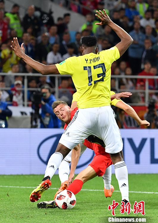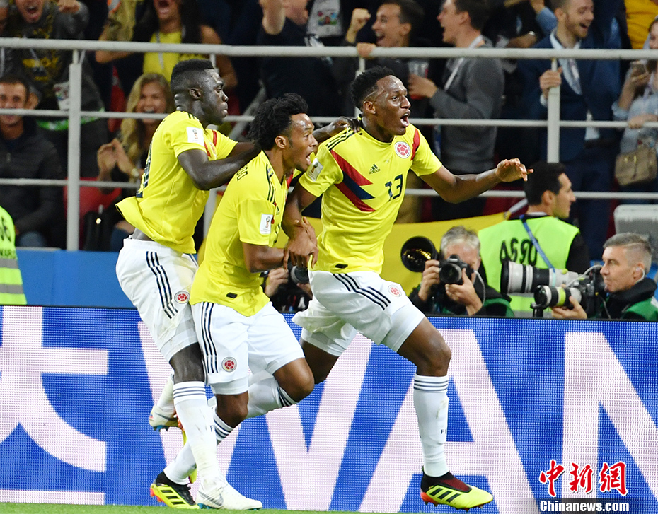 伤停补时第2分钟,顽强的哥伦比亚队扳平比分。夸德拉多右侧角球开出,米纳在小禁区前高高跃起头槌破门。90分钟结束,两队打成1:1,进入加时赛。中新社记者 毛建军 摄