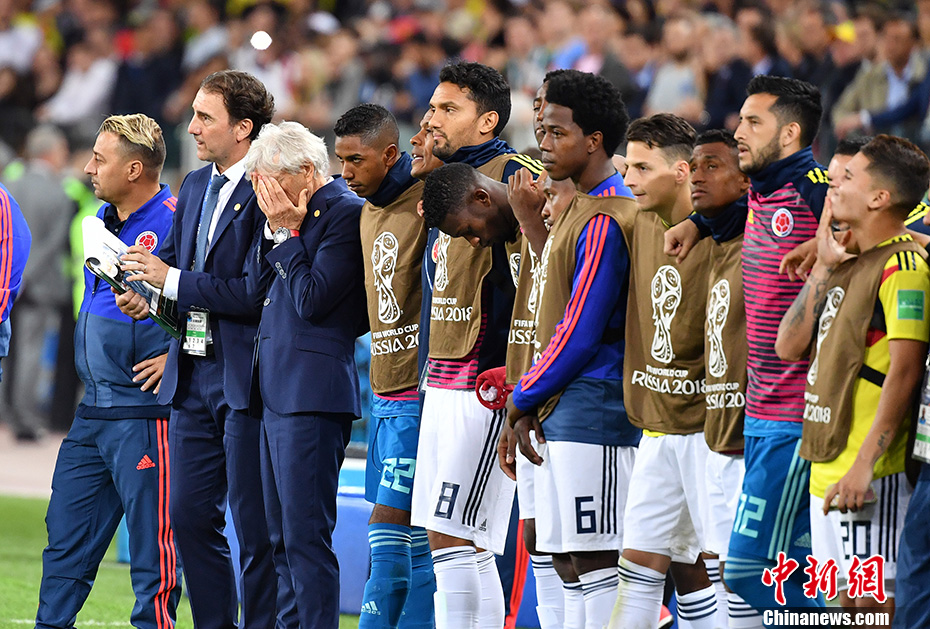 点球大战第一轮,法尔考和凯恩的点球分别命中;随后夸德拉多和拉什福德同样再次命中,前两轮双方打成2:2;第三轮穆里尔将球罚进,但是亨德森的射门却被哥伦比亚门将扑出;第四轮哥伦比亚队乌里贝的射门打在横梁上弹出,特里皮尔将球罚进,两队战成4:4;最后一轮巴卡的射门被门将扑出,英格兰队戴尔命中,最终英格兰点球大战4:3战胜对手,总比分5:4艰难晋级八强。图为点球大战阶段,哥伦比亚主帅佩克尔曼掩面不敢直视。中新社记者 毛建军 摄