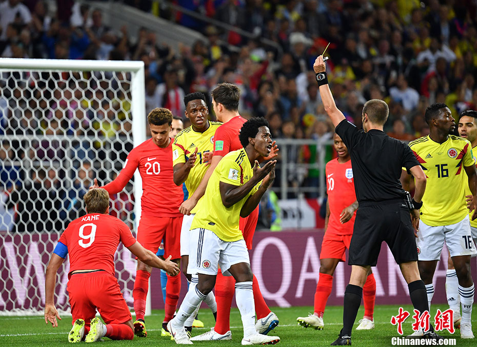 易地再战第57分钟,英格兰队发得出角球,哥伦比亚防守队员桑切斯在争抢中直接把凯恩抱倒在地,主裁判处以极刑,并对桑切斯出示黄牌。双方队员在争执中,英格兰队的亨德森同样领到一张黄牌。哈里-凯恩踢中路一蹴而就,英格兰队1:0领先。中新社记者 毛建军 摄