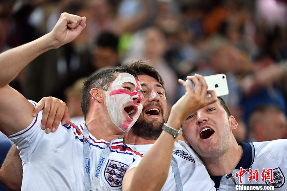英格兰球迷在看台自拍。 中新社记者 毛建军 摄