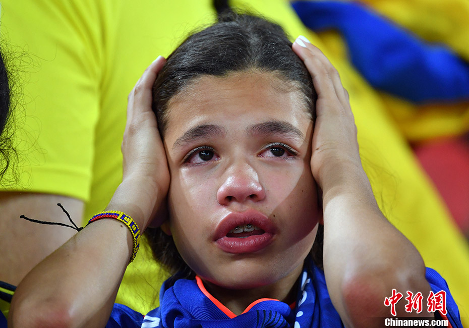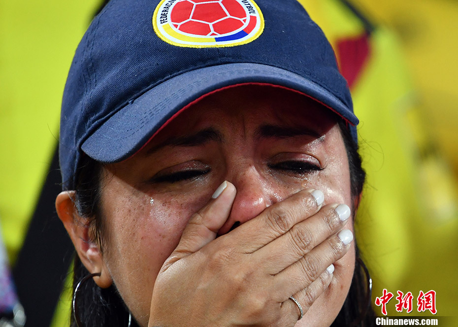 哥伦比亚球迷难过落泪。 中新社记者 毛建军 摄
