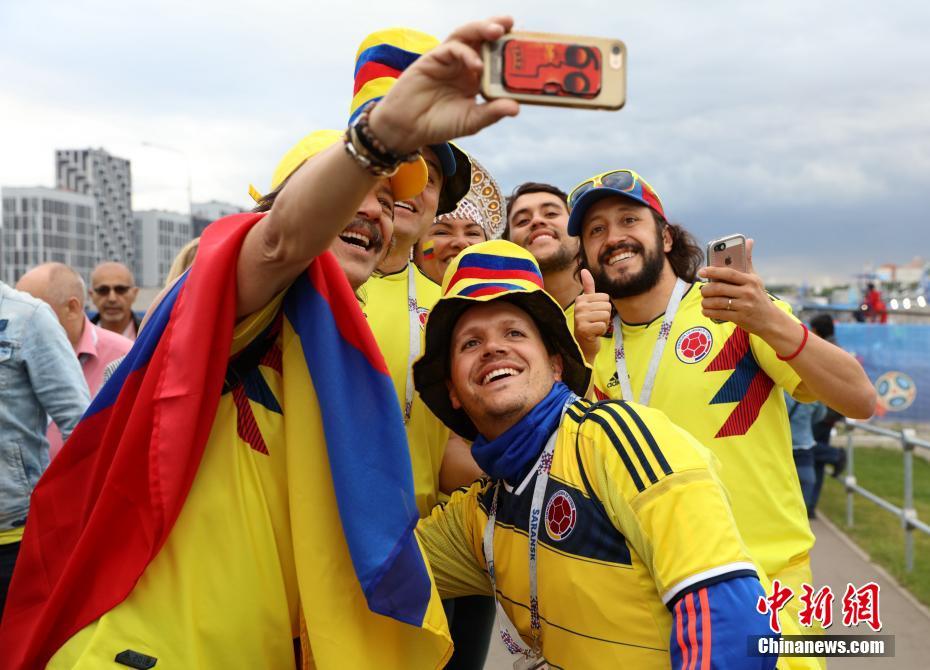 哥伦比亚球迷赛场外玩自拍。 中新社记者 王修君 摄