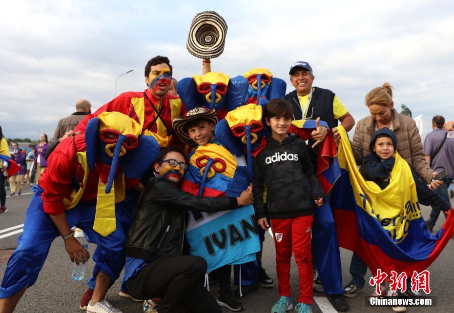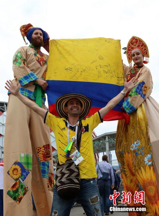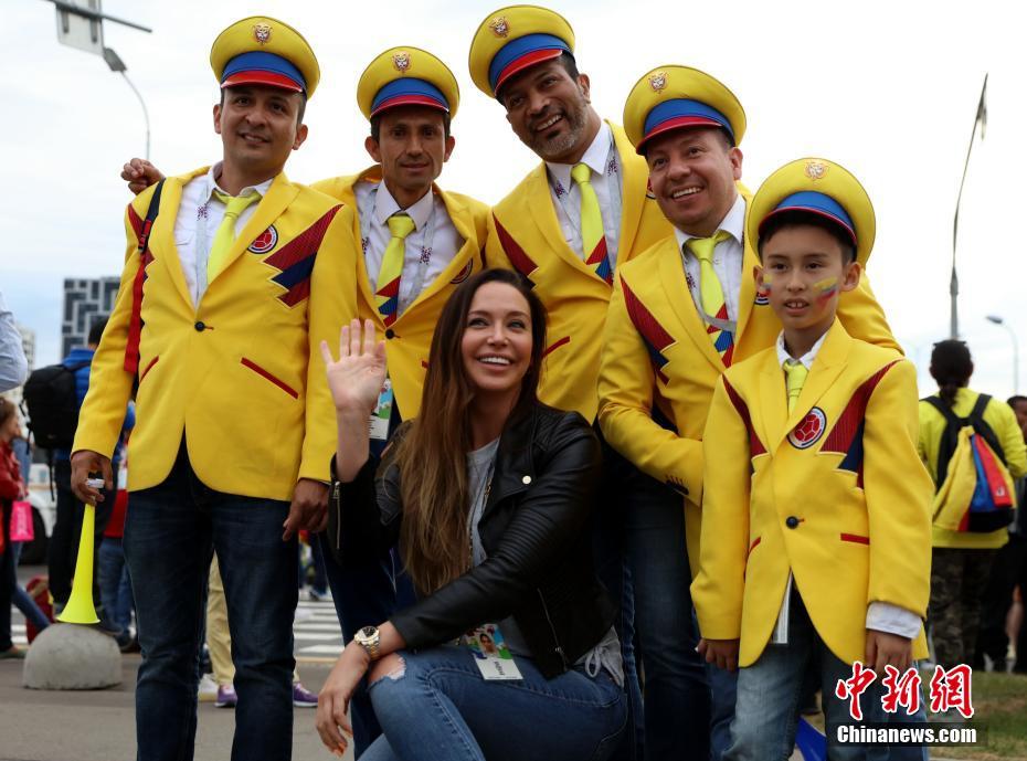 哥伦比亚球迷身着特色服饰拍照。 中新社记者 王修君 摄