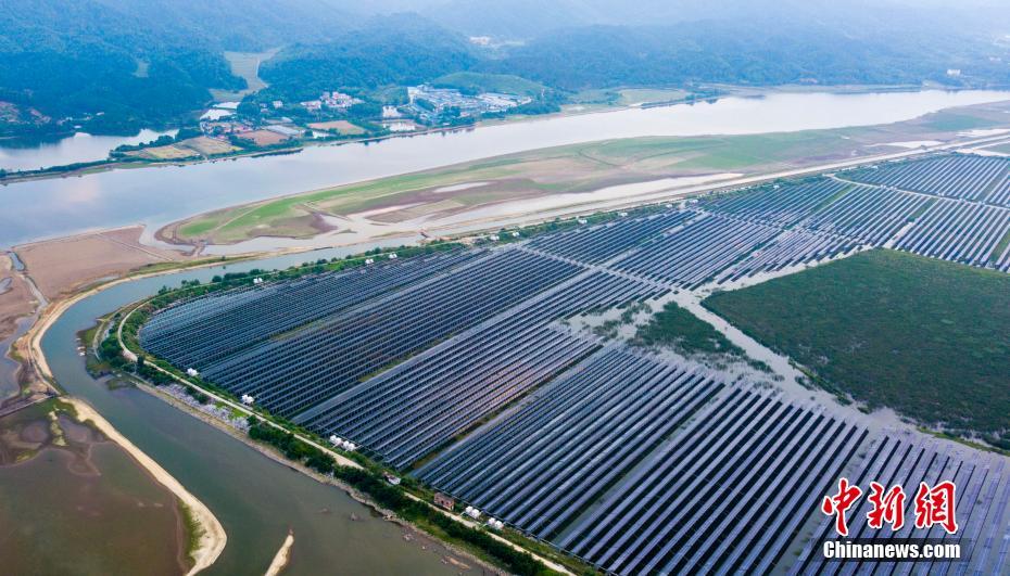 5月17日,江西省新余市分宜县70兆瓦“渔光互补”光伏电站气势恢宏,周边滩涂湿地引来鱼跃鸟飞,景致如画。当地利用电厂2000多亩废弃灰坝,投资6亿元人民币建起“渔光互补”光伏电站并实现并网发电。往昔煤灰堆积的灰坝成为一处和谐绿色的生态休闲之地。中新社记者王剑 摄