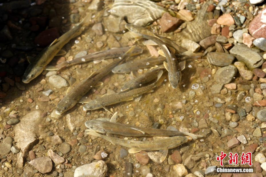 7月10日,在河水中逆流而上的湟鱼。在青海海北藏族自治州刚察县泉吉河畔,成千上万的青海湖裸鲤经过长途跋涉的生命洄游,来到此地繁衍生息。青海湖裸鲤,又称湟鱼,为青藏高原土著鱼类,是青海湖中特有的物种,是青海湖中唯一的大型经济鱼类,也是青海湖“水—鸟—鱼”生态链中的核心物种,2004年青海湖裸鲤被列入《中国物种红色名录》濒危物种名单中。每年5月下旬到8月中旬,在湖中生长的湟鱼会沿着入湖河流溯流而上,进入到河流淡水区域产卵,然后再回到湖中。青海湖环湖地区有数十条淡水河与湖相连,其中,布哈河、沙柳河、泉吉河、黑马河和哈尔盖河是湟鱼洄游的主要河道。中新社记者马铭言 摄