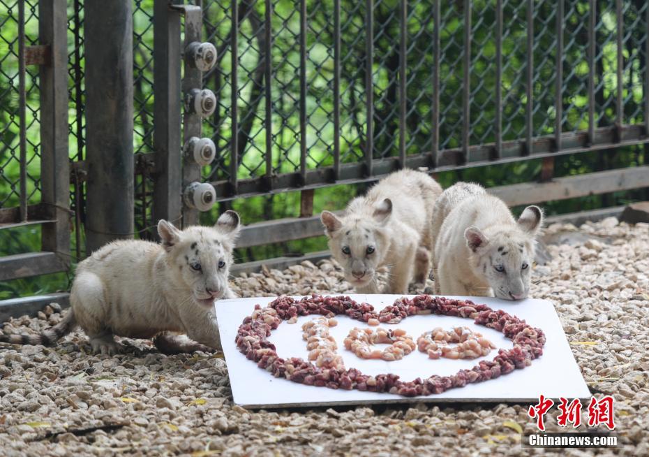 7月10日,雪虎五胞胎分享“肉馅蛋糕”。当日,济南野生动物世界五胞胎雪虎诞生满百日,正式与游客见面。中新社记者 张勇摄