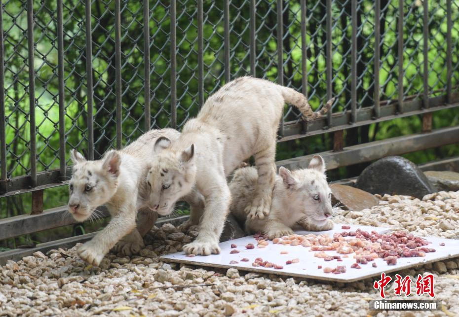 7月10日,雪虎五胞胎分享“肉馅蛋糕”。当日,济南野生动物世界五胞胎雪虎诞生满百日,正式与游客见面。中新社记者 张勇摄