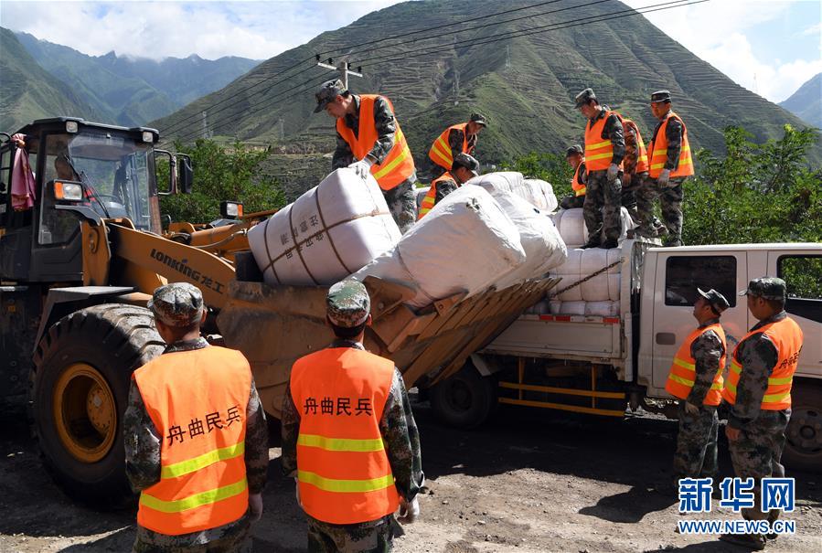 7月16日,在舟曲县南峪乡,当地民兵使用大型机械运送救灾物资。